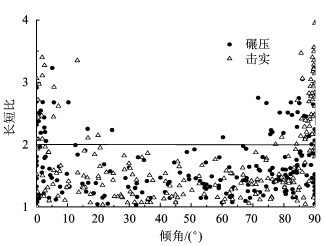 观察图 8可以看出,当图像集料的长短轴比例小于2时,平面集料的就位方向呈现随机分布的特点;当集料长短轴比例大于2时,集料的扁平特性对就位方向具有显著影响,在锤击和碾压作用下,集料更偏向于水平就位或竖直就位,集料长短比越大,其就位方向越集中。 4 结论