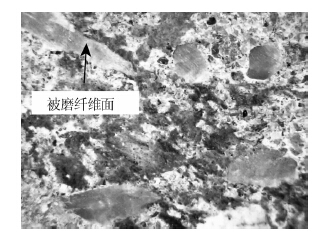 根据文献[19]粉煤灰在水泥混凝土中起到微粉充填作用,微粉填充水泥水化物的空隙,降低混凝土的空隙率;粉煤灰的火山灰活性作用,使水泥发生二次水化反应消耗部分Ca(OH)2,低碱水化硅酸钙胶凝增加,同时减少水泥石与骨料界面过渡区的厚度及Ca(OH)2富集和排列的程度。但从本次磨耗试验结果(图 10)中可以看出粉煤灰掺量不同的3组(FZFZ、FTFZ、FFFZ)试件的抗磨耗性随粉煤灰掺量的增大而减弱。主要原因在于粉煤灰掺量越高混凝土早期(28 d)强度比基准混凝土明显减弱,影响了混凝土的磨耗抵抗性能。因此在早期粉煤灰掺量对混凝土的耐磨耗性影响较大,当掺量(Ⅰ级灰)30%时和纤维的复合效应与基准混凝土的磨耗抵抗性非常接近。从图 11可见,磨耗面中纤维构成浆体中的骨架连接,增强了结构的连续整体性。
