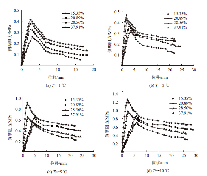 2.2 温度和含水率与桩侧摩阻力的关系鉴于文献[17]中所做类似试验采用的冻结温度从-1~15 ℃之间,本次试验将模型桩在冻结温度T分别为-1,-2,-5,-10下经历1次冻融循环,通过数据采集装置直接得出桩土位移以及换算得出的桩身侧摩阻力,实测桩头位移与桩侧摩阻力的变化曲线绘制成图 3。