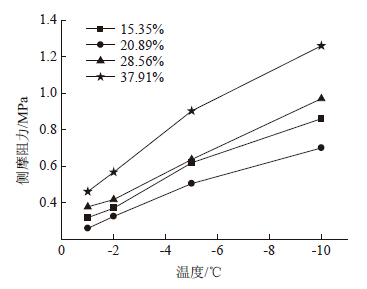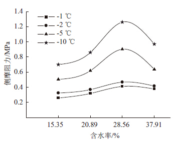 为更直观、系统地观察侧摩阻力与含水率、温度的关系,将不同含水率、不同温度的侧摩阻力与桩土位移曲线中的最大值连接成一条曲线,绘制在同一坐标中,绘制成图 4。如图 4所示,当冻结温度在-1~-10 ℃范围内,同一含水率土样,桩侧摩阻力随冻结温度的降低而增大,其变化递增趋势已基本接近于线性变化。