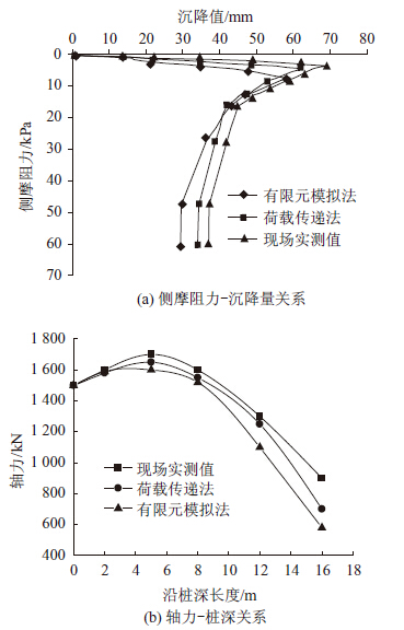 将上述实测的桩基数据用有限元软件ANSYS进行分析计算。根据桩-冻土体系受力的对称性,建立1/4有限元模型进行计算,模型中冻土采用实体Solid45单元,竖直荷载设为7 500 kN,后经处理分析计算后,将实测数据、模拟数据以及用优化冻融荷载传递模型计算的数据绘制成曲线图 7进行分析。图 7表明,本文所建立的本构模型的数值计算与现场监测结果吻合度较高。