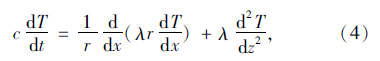 本文所研究的本构模型一般只针对于桩基础,而桩基一般都可视为轴对称模型。根据笛卡尔坐标系下三围非稳态热传导微分方程,设测量点离桩身水平距离为r,埋设深度为z,对于轴对称带相变的热传递问题,在笛卡尔坐标系下用柱坐标可将温度T描述为: