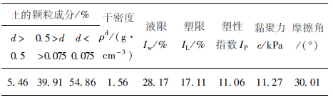 | 土的颗粒成分/% | 干密度ρd/(g·cm-3) | 液限Iw/% | 塑限IL/% | 塑性指数IP | 黏聚力c/kPa | 摩擦角/(°) | ||