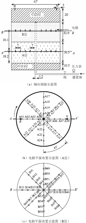 地电测试电极布置及相关尺寸数据如图 1所示。电极共分两层,每层32个,共计64个,分别置于A层和B层,沿径向剖面垂直布设在模型中。在A层,A-A′剖面电极从A开始,顺时针方向依次分别编号为1#,2#,…,8#,9#,…,5#,…,32#(见图 1(b));同样在B层B-B′剖面,测试电极编号依次为33#,34#,…,63#,64#(如图 1(a)所示)。A,B上下两层电极顶点间距30.1 cm。单个电极长度约4.5 cm。电极距为7 cm,距注浆管7 cm。