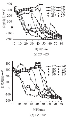 注浆开始时间记为0点。表 1为浆液扩散至各编号电极位置的时间情况。A层25#~32#电极所示剖面上不同位置处电极自然电位随时间的变化情况如图 2所示(图 2和图 3中虚线框标注中箭头指的是电位突降点对应的时间,也即浆液扩散到达时间)。由图 2(a)可见,由于A层渗透率较大,浆液很快(因0~5 min中缺少测试点,估测时间约为3 min)扩散至在距离渗透中心(PVC管)较近的28#,29#电极位置附近,渗透距离为7 cm,表现为电极自然电位快速下降;8.1 min时扩散至27#,30#电极位置处;27.1 min时扩散至26#,31#电极位置处;42.2 min时扩散至25#,32#电极位置处。图 2(b)为17#~24#电极情况,分析过程与图 2(a)类似,1#~16#与图 2类似,这里不再详述。