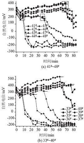 | 图 3 25#~48#电极自然电位随时间变化曲线Fig. 3 Natural potentials of 33rd~48th electrodes in layer B varying with time |