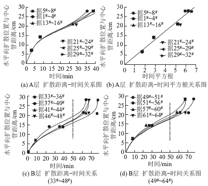 图 4为A,B两层水平方向浆液扩展至距离注浆管不同位置的历时情况。由图 4和表 1可知:(1)渗透性好的A层扩散速率明显快于B层;(2)对于渗透性较大的A层来说,浆液在水平方向的扩散较为均匀;B层在扩散后期各个方向上则呈现出一定的离散性;(3)A层的水平扩散距离dLA和时间t的关系可近似有dLA∝t(图 4(b)所示);B层水平扩散距离dLB和时间t关系呈现为反“S”形,前50 min有和A层情况类似,但扩散速率则相对要慢很多,50 min后呈现为快速扩展阶段。