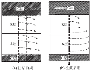 出现上述情况的原因有:(1)由于A层渗透性好,注浆过程中A层孔隙很快被浆液全部充填(历时约45 min),相比之下B层则要慢得多;(2)在三维地层被充填过程中,浆液除了存在水平扩散外,还存在竖向扩散,初期表现为浆液竖向扩散以从上到下、从注浆中心管向模型器壁的三维扩散(图 5(a)所示);扩散后期,特别是A层被充填后,在B层中表现为注浆中心管附近从上到下,从中心管向模型器壁扩散,在模型器壁附近表现为沿着器壁上升,甚至向注浆中心管方向扩散,见图 5(b)。