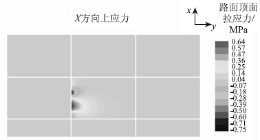 按照表 1~表 3所选择的参数,使用 ISLAB2000进行计算,并确定了不同路面结构形式下横向开裂位置板顶的拉应力,应力云图的算例输出见图 2。