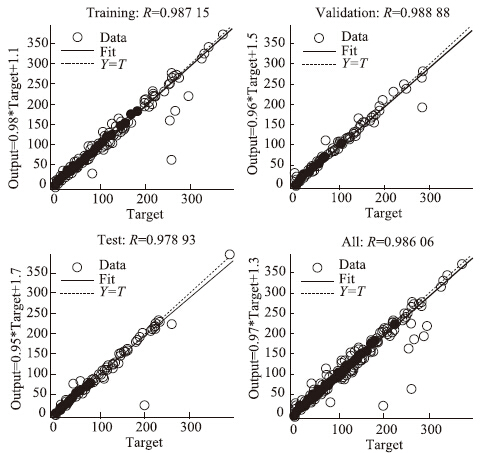 输入的5个因素依次为:路面的相对刚度半径、荷载作用的位置(路面纵向边缘中部或者横向开裂一侧)、开裂间距、LTEC和LTES。ANN预测的输出则为80 kN的单轴荷载作用在CRCP临界荷位时产生于混凝土板顶的拉应力STT (Tensile stress on top of PCC)。在训练过程中使用70%的数据进行训练,并分别用15%的数据进行测试和验证,从图 3可以看出目标值与输出值具有很好的线性关系,相关系数R都达到0.97以上,可见培训的结果十分理想。