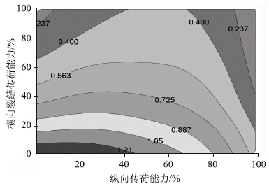 3.2 传荷能力对板顶拉应力的分析美国2002路面力学-经验设计法认为裂缝的传荷能力对路面的响应十分关键,然而Won[14]等进行的裂缝间传荷能力的调查发现几乎所有的路段LTEC调查结果都是90%以上,因此CRCP使用性能上表现出来的差异,很可能来自不同路肩传荷能力对CRCP板顶应力的影响。为进一步分析LTEC和LTES对板顶拉应力的影响,本研究绘制了应力水平等高线云图(图 5),结果显示:当传荷能力大于60%时,纵向传荷能力在梯度方向上的应力变化趋势明显大于横向裂缝传荷能力。