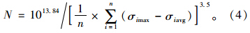 式中,N为结构疲劳寿命; ke为反映应力强度大小的系数;S为应力幅值; C=1013.84;k为形状因子,k=VN-1.08,其中变异系数VN取均值0.53。