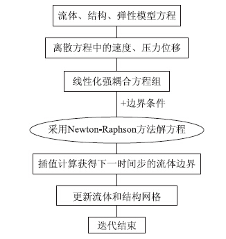 目前流固耦合问题的数值计算方法有弱耦合法和强耦合法[9, 10],以往的大部分流固耦合方法是首先分别对流体方程和结构方程单独求解,再交换数据进行循环求解的弱耦合方法[9],这种方法的缺点是流体域网格和结构域网格不一致,使流固交界面上的平衡条件不能精确满足,导致结果易发散[10]。本文拟采用同时求解流体方程和结构方程的强耦合方法解决这一问题,以增强结果的稳定性和准确性。