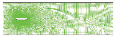 计算区域外边界为矩形,计算域尺寸为279 m×93m(9B×3B,B=31 m,B为断面宽度),上游距断面为1.5B(B为断面宽度),两侧距断面为1B,下游距断面为6B。网格划分如图 3所示。计算网格采用分块结构化网格,在靠近物面处加密,单元数约为14万,离结构表面最近的网格间距小于0.003B,网格划分如图 3所示。
