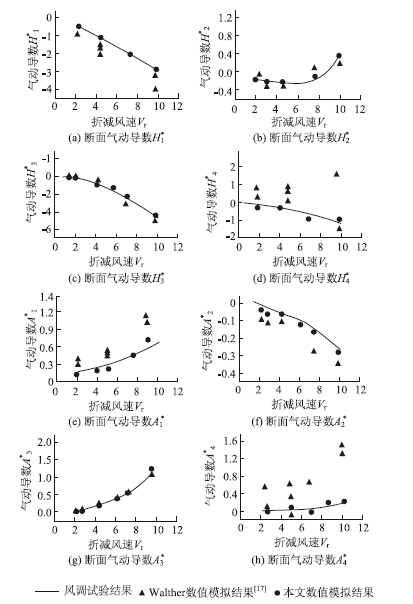 这里采用Scanlan[16]提出的颤振导数方法进行颤振分析,进而计算得到颤振临界风速。本文给出了采用本文方法计算得到的气动导数(具体公式可参加文献[16])与风洞试验和已有数值模拟结果进行了比较,结果见图 5。