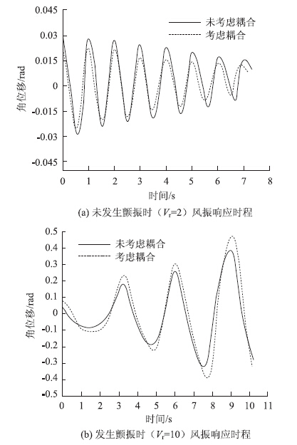 为了进一步分析流固耦合作用对桥梁断面风振响应的影响,这里也研究了未发生颤振(稳定状态)下和发生颤振(失稳状态下)桥梁断面的风振响应(角位移)时程,对采用本文方法考虑流固耦合作用和不考虑流固耦合作用(不考虑流固耦合作用时采用ANSYS计算)的计算结果进行了比较,如图 6所示。