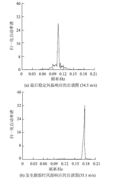 图 7(a)给出了结构的最后稳定风振响应(颤振发生前,其风速为34.5 m/s)的自谱图,图 7(b) 给出了颤振刚发生时(风速为35.1 m/s)风振响应的自谱图。
