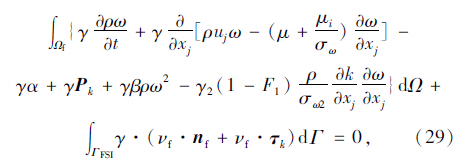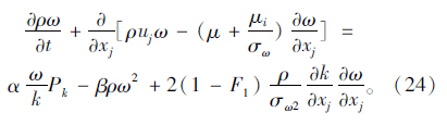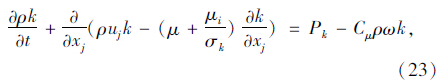式中,k是湍动能; xj为坐标分量;w为耗散率;μ为液体黏性系数;ui,uj为流体的速度分量;Pk为平均应变率的张量模量。