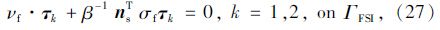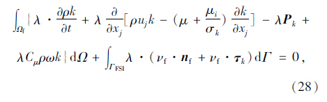 在强耦合整体方法中,湍流模型也采用Galerkin有限元法进行离散。湍流边界层采用滑移边界条件,垂直于壁面的流体速度由固体壁面的法线方向速度给定,并结合壁面摩擦边界条件: