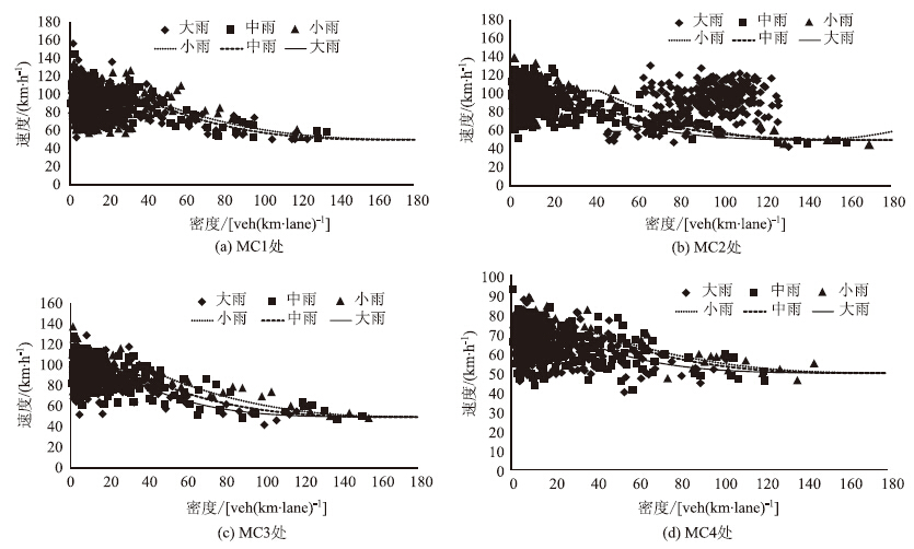 图 3为不同降雨条件下各调查点的速度-密度分布标定结果。可以看出,自由流速度均随降雨强度的增大而减小,非自由流速度也均随降雨强度的增大而降低。