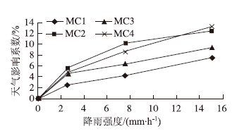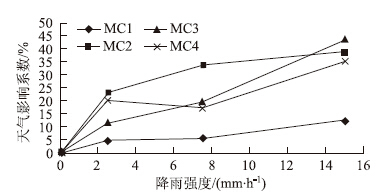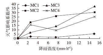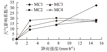 从图 4可以看出,除MC4处外,最大交通流率随降雨强度的增加而降低,对应的天气影响系数增大。小雨天气下,高速公路最大交通流量与无降雨天气相比平均降低15.7%;中雨天气下,最大交通流量与无降雨天气相比平均降低19.1%;大雨天气下,最大交通流量与无降雨天气相比平均降低32.5%,即降雨强度越大,高速公路最大服务交通量越低。
