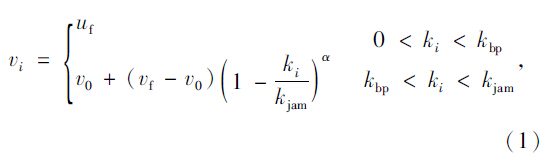 如图 1所示,当路段密度ki小于分界密度kbp时,路段速度为自由流速度uf,当路段密度ki大于分界密度kbp时,路段速度服从修正Greenshields模型。