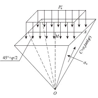 (3)地基土体破坏时假定为不变形的刚塑性体,黏聚力为c,内摩擦角为φ,且服从摩尔-库仑强度理论;