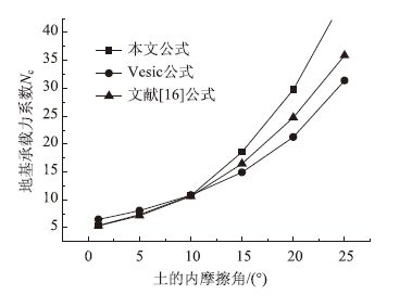 | 图 7 承载力系数Nc与内摩擦角的关系 Fig. 7 Relationship between bearing capacity coefficient Nc and internal friction angle |