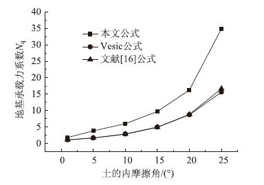 | 图 8 承载力系数Nq与内摩擦角的关系 Fig. 8 Relationship between bearing capacity coefficient Nq and internal friction angle |