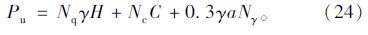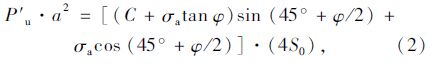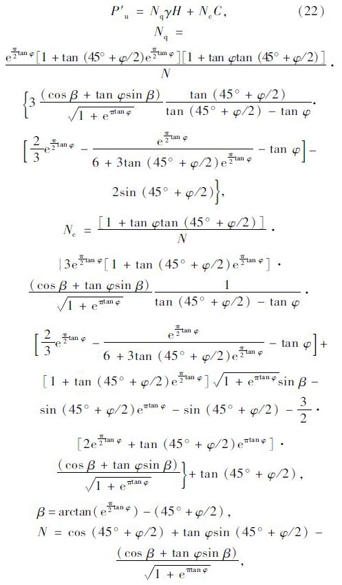2 公式推导参照文献[19],本文采用两步假设来计算:第一步,假设基底下地基土的自重为0,推导出地基极限承载力P′u;第二步,假设地基无黏聚力、无超载,可推导出另一个极限承载力P″u,通过叠加,得到地基极限承载力Pu=P′u+P″u。