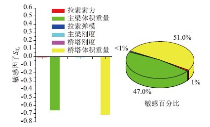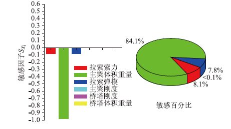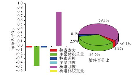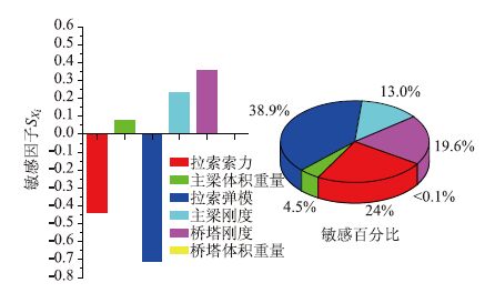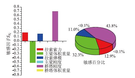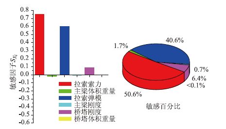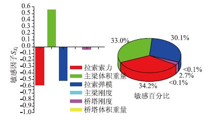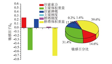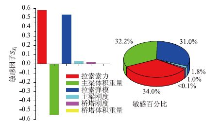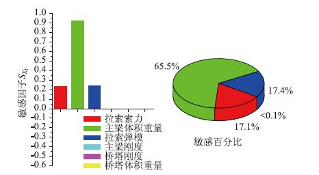 (2)从图 10可以看出拉索索力、主梁体积重量及拉索弹模对主梁弯矩的影响比较敏感,敏感因子SXi分别为-0.588,0.568,-0.517;而桥塔刚度的敏感因子仅有0.046,其余接近0。从敏感百分比来看,拉索索力、主梁体积重量及拉索弹模这3个参数的敏感百分比分别为34.2%,33.0%与30.1%,是塔梁结合部主梁弯矩的主要影响参数;而其他参数的敏感百分比最大为2.7%,是可忽略影响参数。