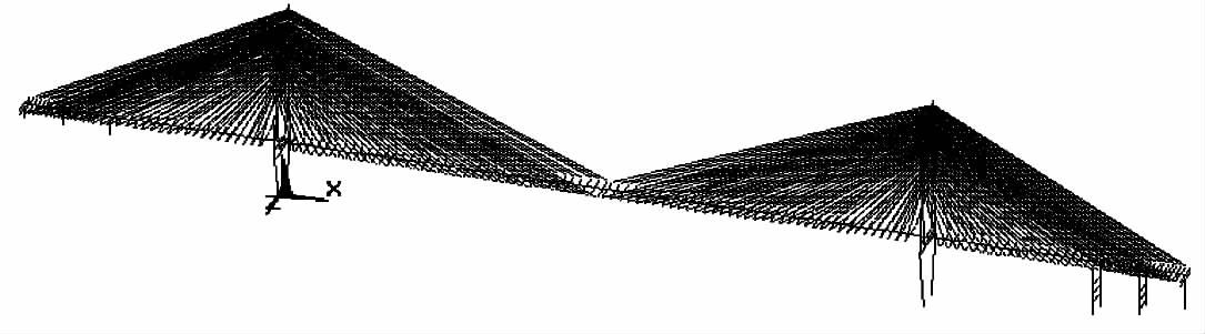 采用通用有限元程序ANSYS建立有限元模型见图 2,全桥共划分为1 095个单元,1 269个节点。主塔及主梁单元均采用梁单元进行模拟;斜拉索用桁架单元模拟,拉索的非线性影响通过等效弹性模量进行考虑。不考虑桩基础的影响,承台底面处的边界条件模拟为固结。