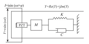 1 压电阻抗法的工作原理基于压电陶瓷(piezoelectric ceramic,简称PZT)的压电阻抗法(electro-mechanical impedance,简称EMI)就是应用压电陶瓷的力-电耦合特性,综合考虑压电陶瓷的动态特性和梁的阻抗信息而提出的一种实时监测方法。本文采用一维模型模拟PZT与预应力混凝土梁结构之间的相互作用(见图 1),建模时需考虑PZT的动态特征和梁的阻抗,模拟时PZT在交变电压作用下被看成一个薄片,仅能产生纵向膨胀和收缩。PZT与梁结构耦合作用下的电导纳公式为(Liang等[13]):