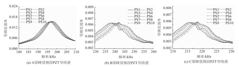 图 5为3根预应力混凝土简支梁各个PZT的压电导纳。从图 5可以看出,3根梁PZT的共振频率随着预应力值的增大而增大。随着预应力值的增加,钢绞线开始压缩混凝土梁,增加了梁的抗弯刚度,PZT的导纳谱发生偏移,这说明了压电阻抗技术可以用来监测预应力混凝土梁的预应力值的变化。