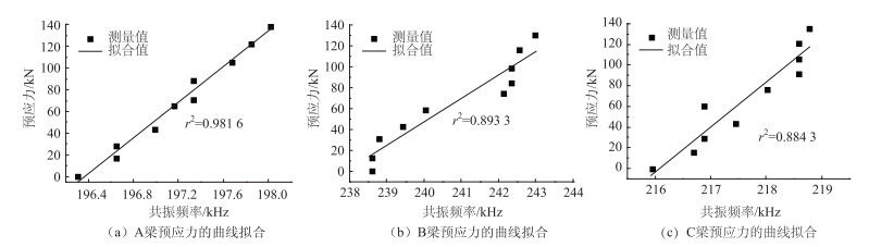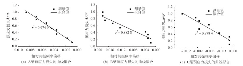 图 6为以共振频率为指标的曲线拟合图,图 7为以共振频率偏移为指标的曲线拟合图。从图 6和图 7可以看出,3根梁的确定系数r2都比较高。A梁属于轴压构件,B梁和C梁属于压弯构件,说明无论是轴压构件还是压弯构件,预应力值和共振频率都是强烈的线性关系,预应力损失和共振频率偏移也是强烈的线性关系。这样就可以通过对PZT压电阻抗分析,得到预应力混凝土梁的预应力值和预应力损失。