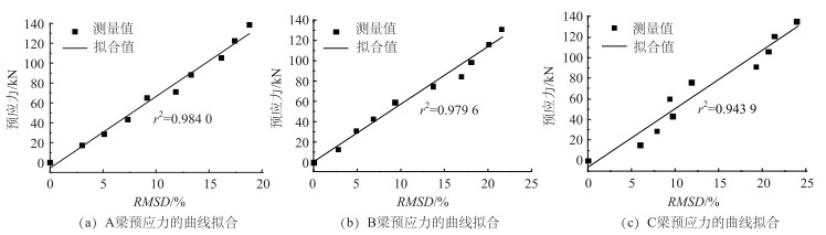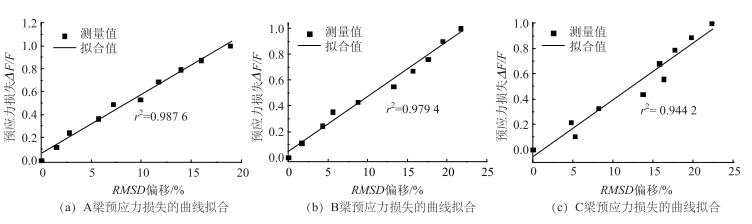 图 8为以RMSD为指标的曲线拟合图,图 9为以RMSD偏移为指标的曲线拟合图。从图 8和图 9可以看出,3根梁的RMSD值随着预应力值的增大而增大,RMSD偏移值也随着预应力损失的增大而增大。同时,3根梁的确定系数r2都比较高,说明无论是轴压构件还是压弯构件,预应力值和RMSD都是强烈的线性关系,预应力损失和RMSD偏移也是强烈的线性关系。这样就可以通过对压电导纳谱进行数理统计分析,可以得到预应力混凝土梁的预应力值和预应力损失。