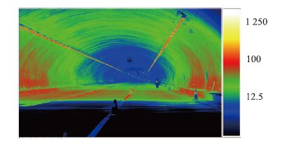 图 1和图 2为部分隧道照明存在无效光通量过高的情况,图片中的灰度表示的是在驾驶人员行车方向和角度条件下,隧道内各部分的亮度水平,图右侧的标尺表示了灰度和亮度的对应关系。