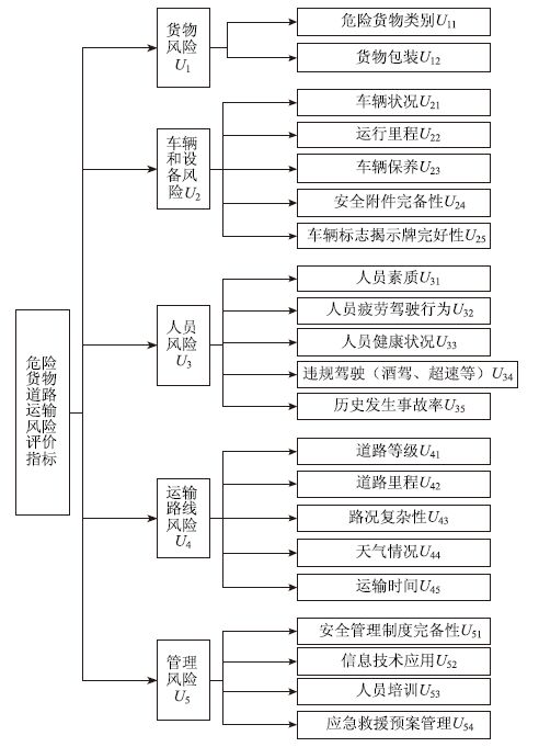 1 危险货物道路运输风险主要影响因素分析通过大量调研分析,本文认为道路危险货物运输企业的主要风险因素包括危险货物风险、车辆装备风险、人员风险、运输线路风险和管理风险5个方面[7, 8, 9]。