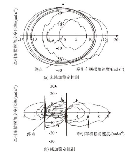 从图 11的牵引车横摆角速度e-$\dot e$相平面图中也可以看出,未施加稳定性控制前,e-$\dot e$终点并不收敛于原点附近,呈现等幅圆周运动,这也说明车辆出现了“摆振”失稳。当施加稳定控制后,系统能很好地将牵引车横摆角速度控制在允许的误差零带之内,将e-$\dot e$终点收敛于原点附近。