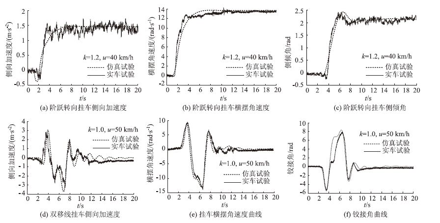 为验证所建立的半挂液罐车仿真模型的准确性,以HYG9404GHY三轴式半挂液罐车为研究对象,进行了阶跃转向和双移线两种工况试验,将测试的车辆运行参数与模型仿真结果进行对比验证。定义充液比k为液体深度h与罐体半径R的比值,即k=h/R。液体晃动等效模型取2阶,限于篇幅,这里仅例举充液比k=1.2、车速u=40 km/h阶跃转向和k=1.0、车速u=50 km/h双移线两种工况实车试验与仿真车辆主要参数比较如图 2所示。