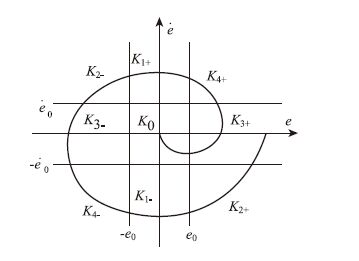 2 相平面分区稳定性控制 2.1 相平面分区控制原理系统运行特性,最直接表征形式为控制量反馈值与理想值的误差e和误差变化率$\dot e$。相平面分区控制是以误差e和误差变化率$\dot e$的相平面为工具,将相平面分成不同的几个区域,每个区域对应系统一种运行工况,在不同区域采用不同的控制作用Ki(i=0,±1,±2,±3,±4),使之建立起一一对应关系[13]。通过对误差e和误差变化率$\dot e$的判断,来确定此刻控制力Ki的选择。控制示意如图 3所示。