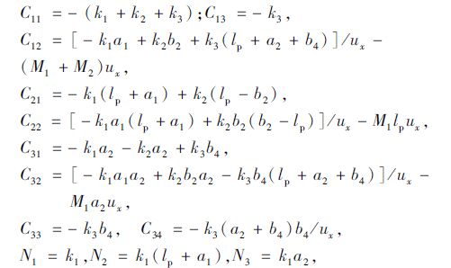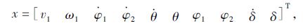 2.2 控制变量参考响应在车辆稳定性研究中,车辆横摆角速度和质心侧偏角是描述车辆运动状态的重要参数。横摆角速度一般可以直接测量,而质心侧偏角只能通过估计算法间接获得。半挂车辆的稳定性是由牵引车决定的,当牵引车为不足转向时,整车都是稳定的;当牵引车为过度转向时,不论挂车为何种特性,整车都将表现摆振或折叠失稳。此外铰接角也可以有效表征车辆的折叠和摆振事故[14]。所以半挂液罐车稳定性控制系统选择牵引车的横摆角速度和铰接角作为控制变量。 参考模型采用线性4自由度单轨半挂汽车模型,模型包括牵引车、挂车的侧向和横摆4个自由度。设该模型中罐体内的液体不具有流动性,其他物理性质都与半挂液罐车动力学模型相同。采用线性轮胎模型,系统的状态空间方程可描述为: