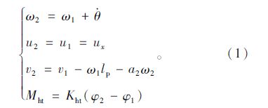 假设车辆的行驶速度为ux,在正常行驶情况下,牵引车和挂车的铰接角θ较小,则半挂液罐车的约束方程可表示为: