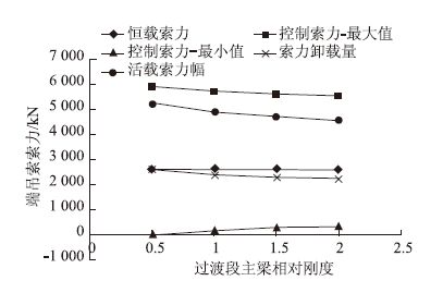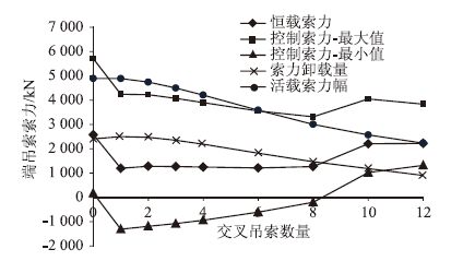图 11给出了端吊索索力随交叉吊索数量的变化曲线。由图可见,当交叉吊索数量由0根增加到1根,端吊索控制索力最小值由174 kN减小到-1 307 kN,出现严重的卸载松弛,这主要是由于在交叉区域内主梁恒载在斜拉索和吊索之间按1∶1进行分配,端吊索恒载储备索力大幅减小所致。此后,随交叉吊索数量的增加,端吊索控制索力最小值不断增大,当交叉吊索数量达到10根以后,由负变正,达到1 184 kN,恒载储备才较为充足,这一方面是由于最不利活载和温度引起的端吊索索力卸载量(=控制索力最小值-恒载索力)不断减小;另一方面也是由于随着交叉吊索伸入斜拉段长度的增加,主梁自重有所增加,端吊索恒载索力增大所致。
