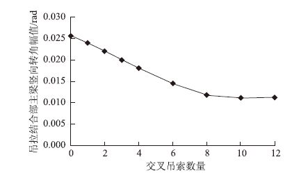 图 13给出了在汽车活载作用下的吊拉结合部主梁竖向转角幅值随交叉吊索数量的变化曲线。由图可见,随交叉吊索数量的增加,吊拉结合部主梁竖向转角幅值不断减小,当交叉吊索数量达到8根以后,曲线变化非常平缓,表明斜拉体系和悬索体系在结合部附近的主梁刚度已过渡平顺。不同交叉吊索数量下的主梁活载竖向转角包络图见图 14。