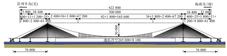 | 图 2 琼州海峡跨海通道主跨3 000 m协作桥方案(单位:cm) Fig. 2 Scheme of Qiongzhou Strait combined bridge with a main span of 3 000 m (unit: cm) |