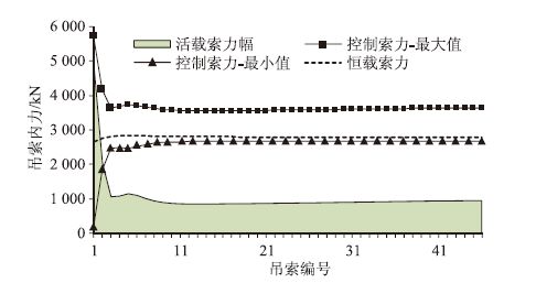 | 图 5 吊索内力图(无交叉吊索) Fig. 5 Internal force curves of hangers (without intersecting hanger) |