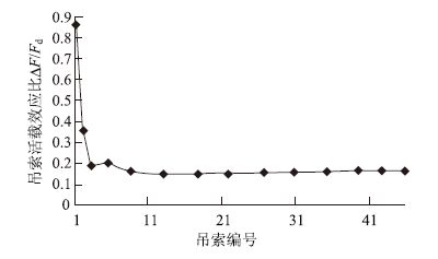 图 6给出了吊索活载索力幅ΔF与控制索力最大值Fd之比(以下简称“活载效应比”)的情况。由图可见,最外侧吊索的活载效应比(即活载应力幅Δσ与控制应力最大值σd之比)达到0.86,远大于一般吊索的0.20。通常为满足吊索抗疲劳要求,需满足以下条件: