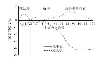 | 图 9 主梁活载竖向挠度(无交叉吊索) Fig. 9 Vertical deflection of girder under live load (without intersecting hanger) |