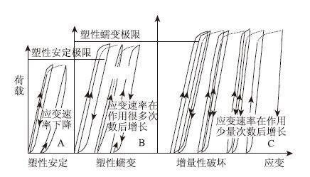 (1) 塑性安定(A区):当材料承受较小荷载时,产生小量塑性变形,随着荷载作用次数的增加,其值将稳定在一个固定值,随后结构体的变形表现为回弹变形,此时认为路面结构是安定的可以接受的;(2) 塑性蠕变(B区):当材料承受的荷载变大时,结构体产生大量塑性变形,塑性变形随荷载作用次数的增加而逐渐变大,但塑性变形率(塑性变形与荷载作用次数的比值)会保持恒定值;此时认为路面在一定的使用期内是安全的,但需要根据路面破坏准则计算路面使用年限;(3) 增量性破坏(C区):当材料承受的荷载很大时,结构体产生较大塑性变形,并且塑性变形率随荷载作用次数的增加而逐渐增加,此种状况在路面设计中是不允许出现的。上述性状表明存在一个区分粒料在重复荷载作用下趋向稳定或者破坏状况的临界应力水平,即安定极限,此极限可以应用安定理论通过理论分析或者试验研究确定。